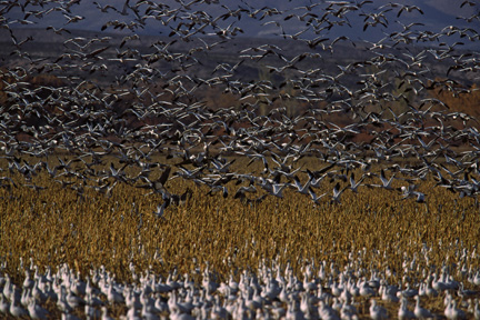 Snow Geese landing on corn field