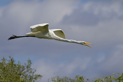 Great Egret in flight calling