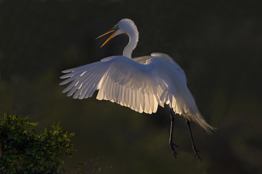 Great Egret landing at evening roost