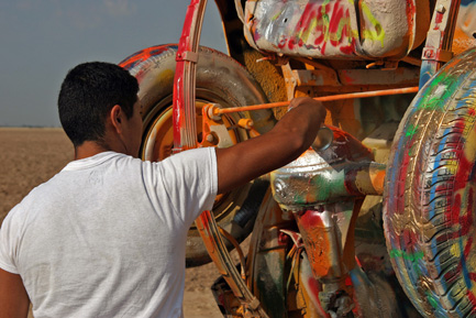 Spraying Graffiti At The Cadillac Ranch Near Amarillo
