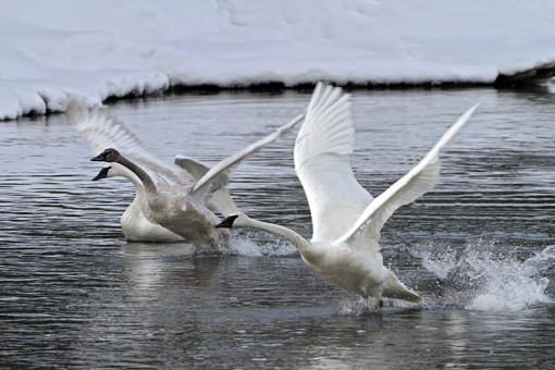 Trumpeter swan group take off